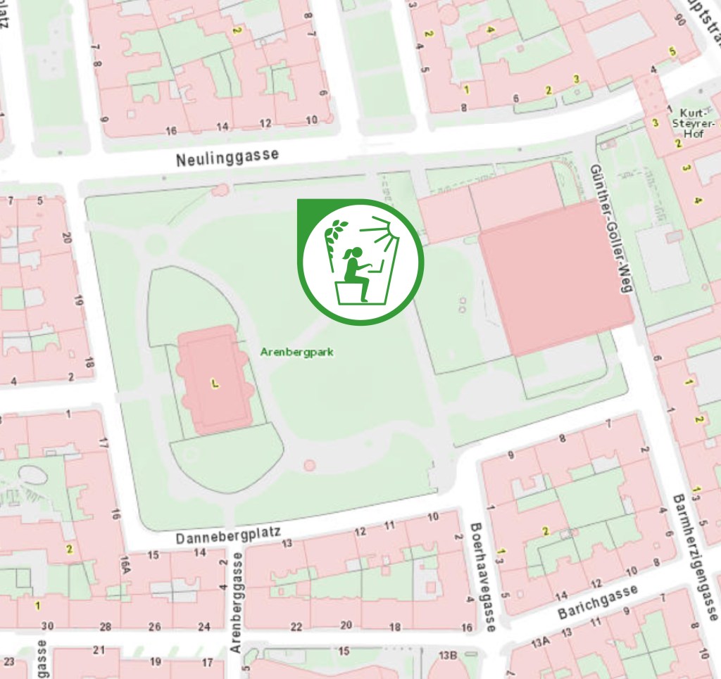Der Arenbergpark ist eine der ältesten Parkanlagen Wiens. Auf Grund der Größe des Parks und seinem alten Baumbestand, hat er eine wichtige Bedeutung für die Bewohner:innen des 3. Bezirks. Die historische Parkanlage wird laufend weiterentwickelt, um den Wünschen der Nutzer:innen gerecht zu werden. Daher wurde nun auch eine Park Working Ladestation errichtet, um das bequeme Arbeiten im Freien und Laden von Solarstrom zu ermöglichen. Die Station befindet sich barrierefrei erreichbar neben dem Parkeingang in der Neulinggasse. Im Schatten der herrlichen alten Bäume, kann entspannt gearbeitet und stromgeladen werden. Der Park verfügt über eine WC Anlage, Gastronomie, Trinkbrunnen sowie zahlreichen Freizeitangebote.