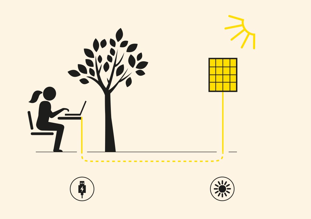 An Park Working Ladestationen kann in kühler, schattiger Umgebung entspannt gearbeitet und Strom geladen werden. Wir nutzen dafür die Kraft der Sonne. Den sauberen Solarstrom erzeugt ein nahegelegenes Photovoltaik Panel. Die Park Working Stationen selbst werden hingegen im Schatten errichtet, um Bildschirmarbeit zu ermöglichen und ein angenehmes Aufenthaltsklima zu schaffen. Eine integrierte Batterie speichert überschüssigen Solarstrom und macht ihn auch an Tagen ohne Sonnenschein für Nutzer:innen verfügbar.